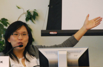 勃鲁克学院副教授梁克发表对福州新移民学生所进行的初步研究成果。(美国《世界日报》/曹健 摄)