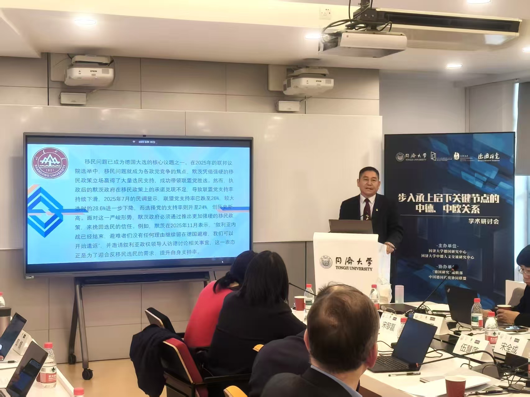 2025年12月13日,中国欧洲学会德国研究分会常务理事、中国社会工作教育学会移民社会工作专业委员会副主任、中国社会学会移民社会学专业委员会常务理事、中国国家移民管理局法律政策咨询专家委员会委员、山东大学移民研究所所长/山大国际移民中心主任、山东大学哲学与社会发展学院宋全成教授,在上海参加了“步入承上启下关键节点的中德、中欧关系”学术研讨会并作了主题为“德国默茨政府移民政策保守化的多维度分析”的发言。