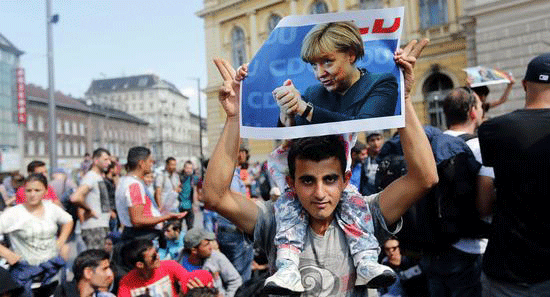 图为一难民从匈牙利启程前往德国前,举着默克尔的头像。(来源:新浪)