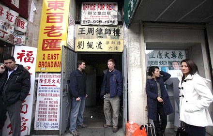 “我们本来是想寻找一名法律专家,以合法的方式办事,”康涅狄格州一家中餐馆的厨师曾航(音译)说。他专门请了一天假,就是为了看看他的申请怎么样了。曾航是聚集在唐人街东百老汇大街2号写字楼的几十名客户之一。这里也遭到了美国联邦调查局(FBI)的突击搜查。