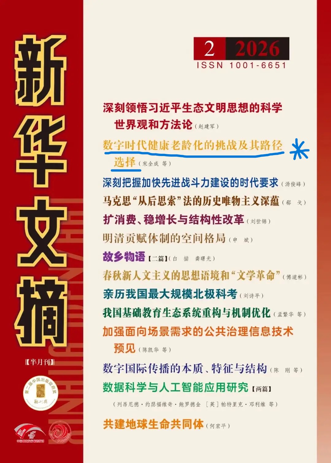 近日,《新华文摘》2026年第2期封面重点推荐并全文转载了哲学与社会发展学院宋全成教授与2022级社会学专业博士研究生张倩的题为《数字时代健康老龄化的挑战及其路径选择》的高质量论文,原文发表于《济南大学学报》(社会科学版)2025年第4期。